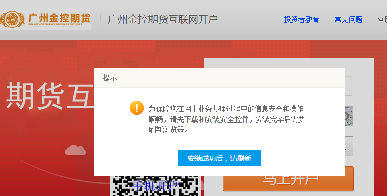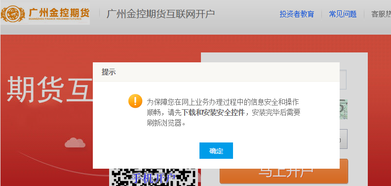 第一步:打开客户端开户网址:https://gzjkqh.cfmmc.com/。点击“确定”安装控件。