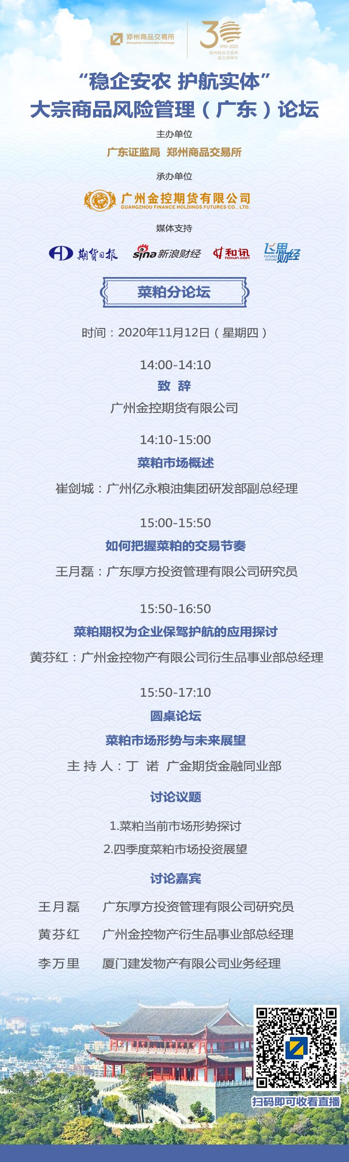 我司诚挚邀请您参加由广东证监局、郑州商品交易所联合举办、广金期货承办的的2020年11月12日14点至17点10分“稳企安农 护航实体”——大宗商品风险管理(广东)论坛——菜粕分论坛。