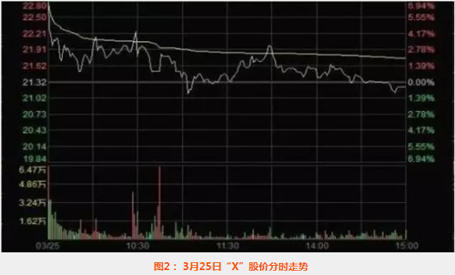 2015年3月23日,唐某某买入“X”214万股,成交金额4144万元,成交均价19.37元,完成建仓。第二天,唐某某从上午10:42开始,以18.91元至涨停价21.32元的价格和100倍于同档位其他投资者申报总量,在短短31分钟内将“X”股价拉至涨停,上涨幅度达12.7%。中午收盘前“X”短暂打开涨停,唐某某又以涨停价和超过卖盘55倍的申买量,5分钟内将股价再次推至涨停。下午开盘后,唐某某继续以涨停价申报买入2796万股,形成巨量堆单将股价封死在涨停板上。