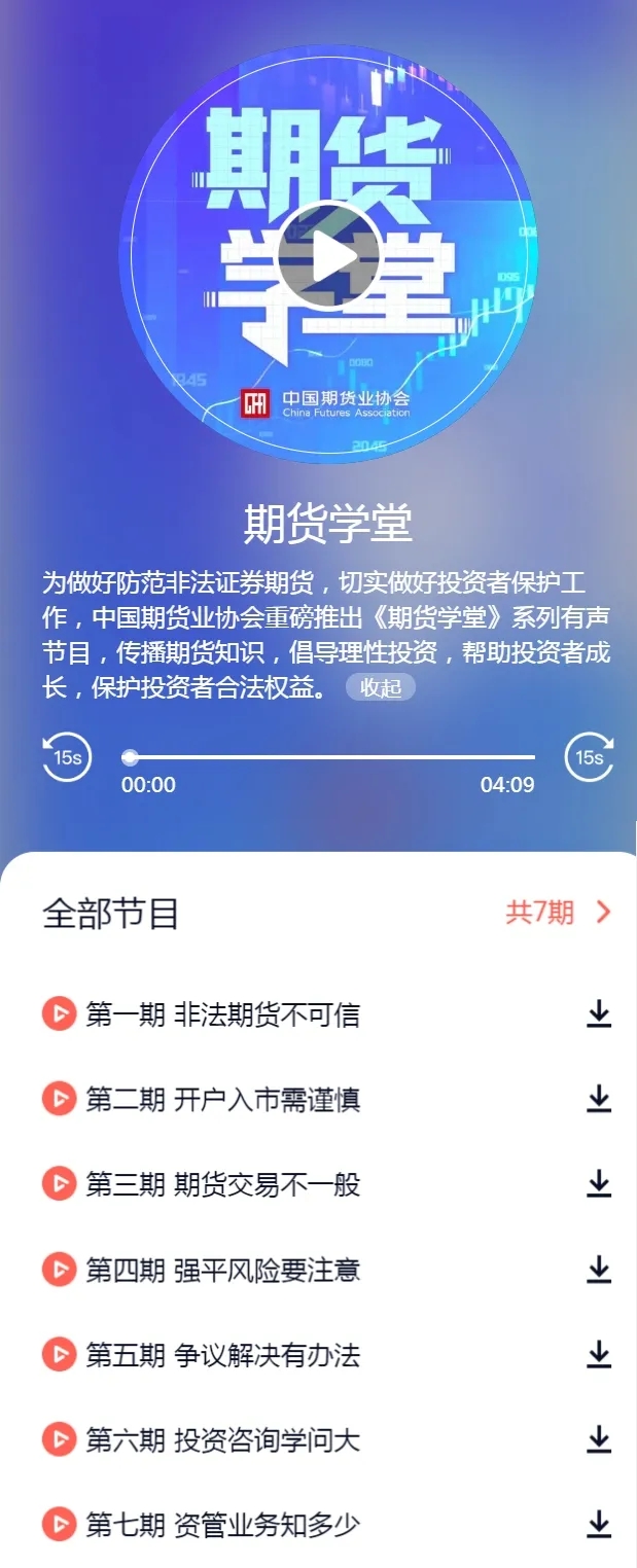 为做好防范非法证券期货,切实做好投资者保护工作,中国期货业协会重磅推出《期货学堂》系列有声节目,传播期货知识,倡导理性投资,帮助投资者成长,保护投资者合法权益