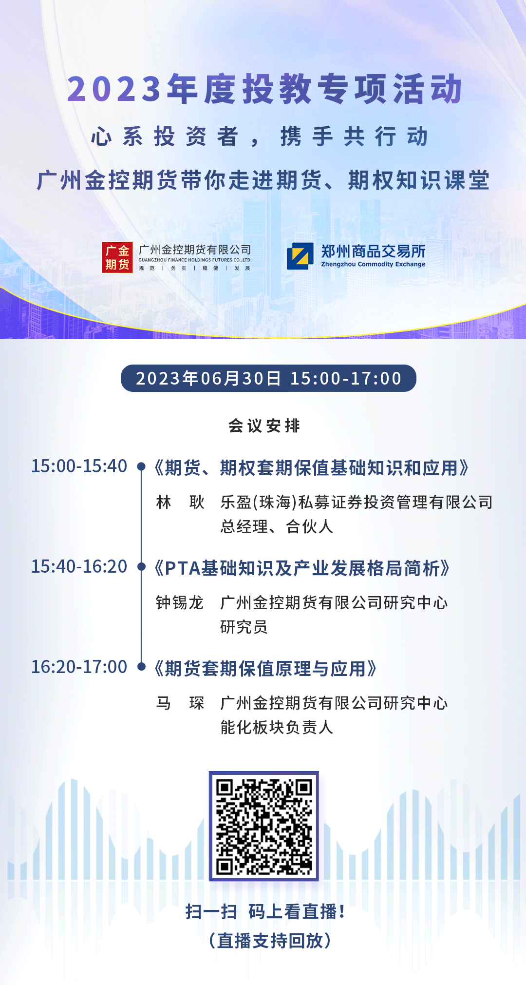 2023年6月30日,广州金控期货有限公司在郑商所的大 力支持下,成功举办了"2023年度投教专项活动—心系投资者,携手共行动——广州金控期货带你走进期货、期权知识课堂",本次会议得到广大投资者的认可,取得了超预期的效果。