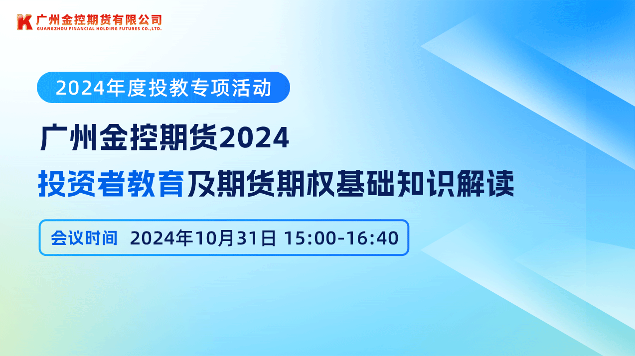 2024年10月31日,广州金控期货有限公司(以下简称“广金期货”)在线上成功举办了2024年度投资者教育专项活动——投资者教育及期货期权基础知识解读讲座。本次活动吸引了来自产业企业、金融机构、机构户及个人投资者等众多线上参与者的热情关注,共计约300多名参会人员齐聚一堂,共同探索期货期权市场的奥秘。