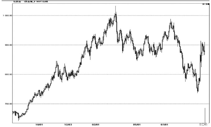 图5 伦敦金日K线图(2007年8月至2008年9月)