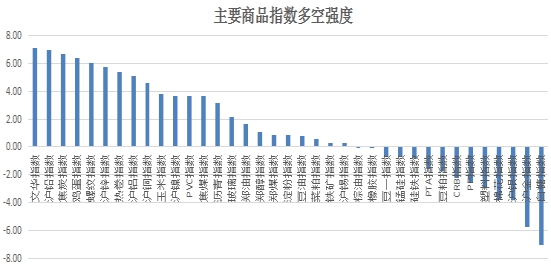 (说明:1、本多空强度排名主要用于判断短期商品的强弱;2、一般数值在0值以上短期偏多,0值以下短期偏空;3、数据采样时间以当天15:00收盘后的数据为准,不含夜盘数据,在第二天开盘前公布,指标表达上可能会有一定延迟;4、具体交易时,需考虑到指数合约与具体合约在多空强度上的差异。)